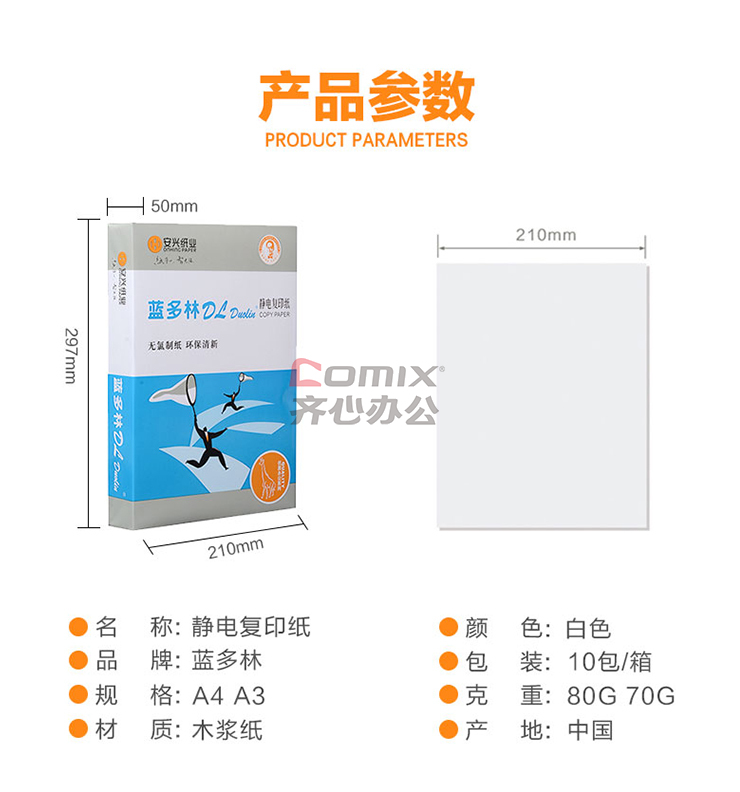 商品名称:安兴纸业蓝多林复印纸 A3 80g 500张/包 5包/箱