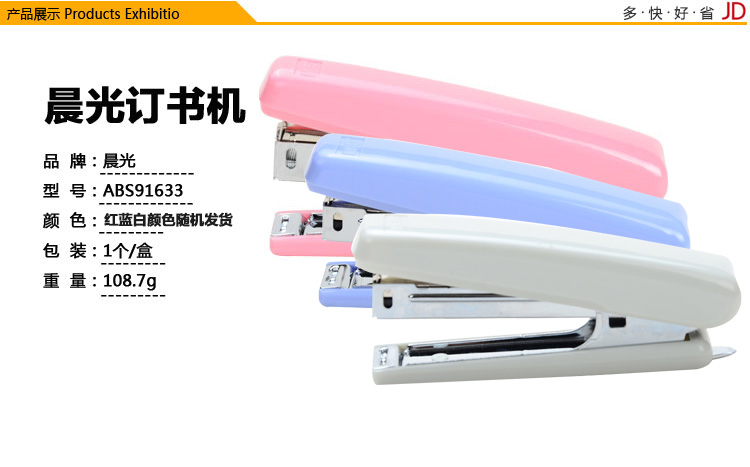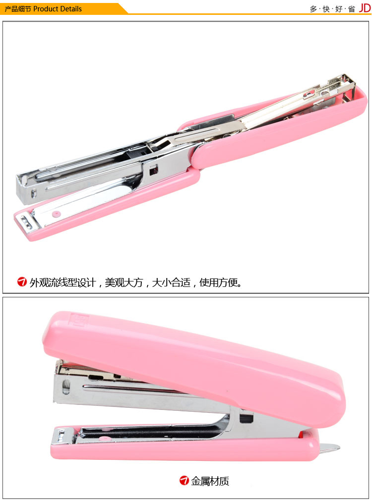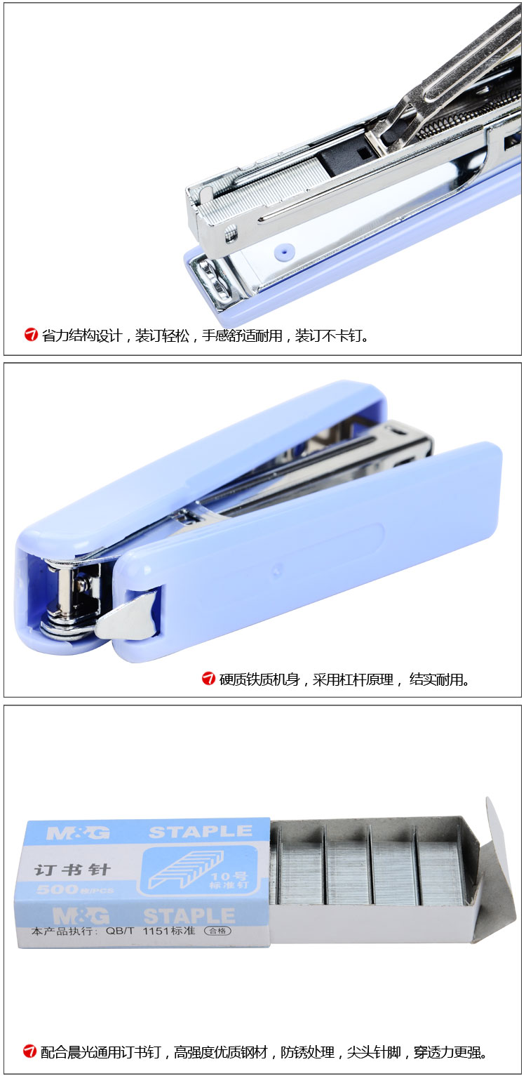 硬质铁质机身 防锈处理 尖头尖脚 穿透力强 内部刚机构 订书机有两种不同的装订方式可以选择 方便观察钉数的观察孔 底部附有防滑橡胶底座 防滑 稳定更安全 搭配订书针 使用更便捷。