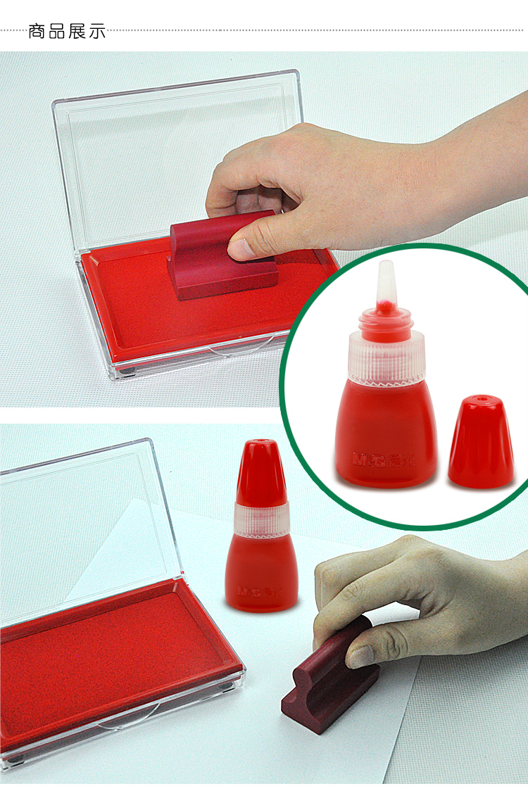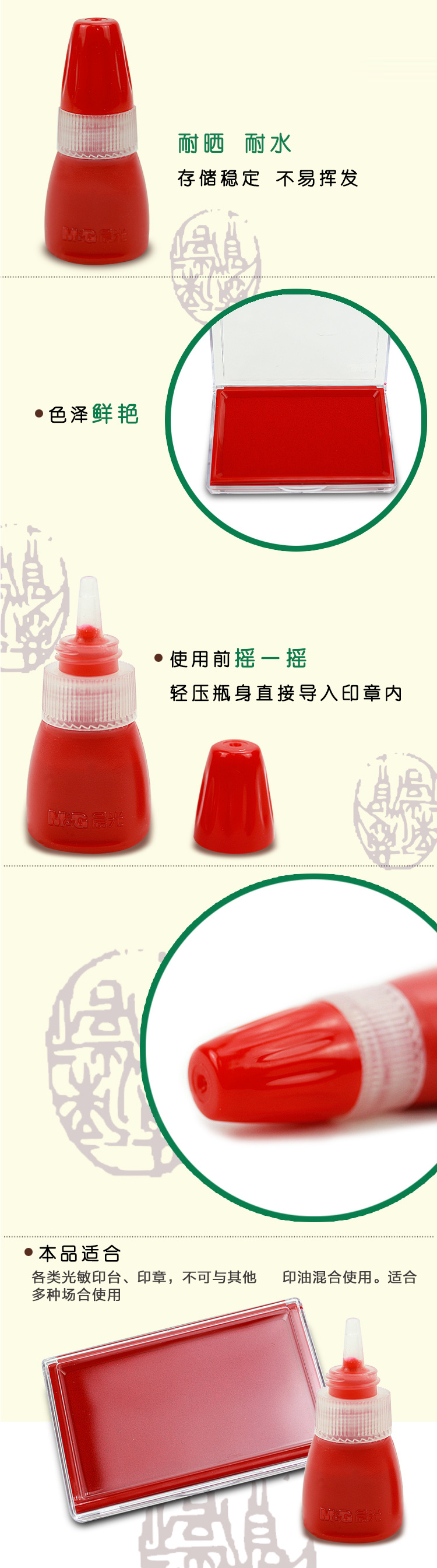 印油耐晒 耐水 存储稳定 不易挥发 色泽鲜艳 本品适合光敏印台印油 使用前摇一摇 轻压瓶身直接导入印章内