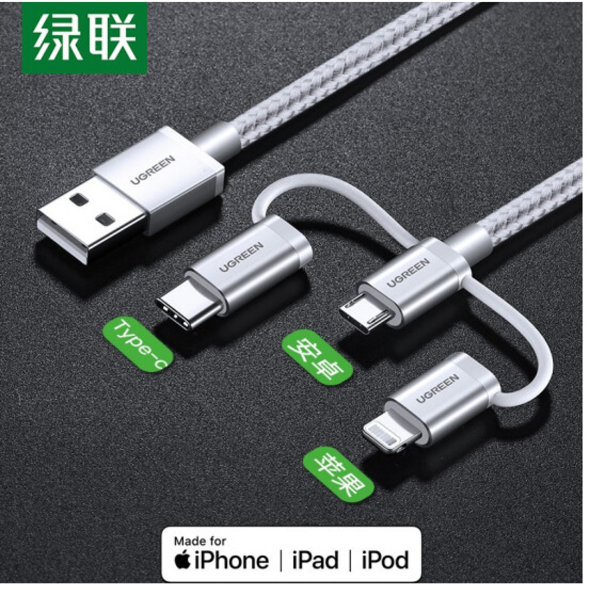 绿联 MFi认证苹果安卓数据线三合一 通用iPhone12/11/7/X小米8华为手机 Type-C快充一拖三多头充电器线转接头