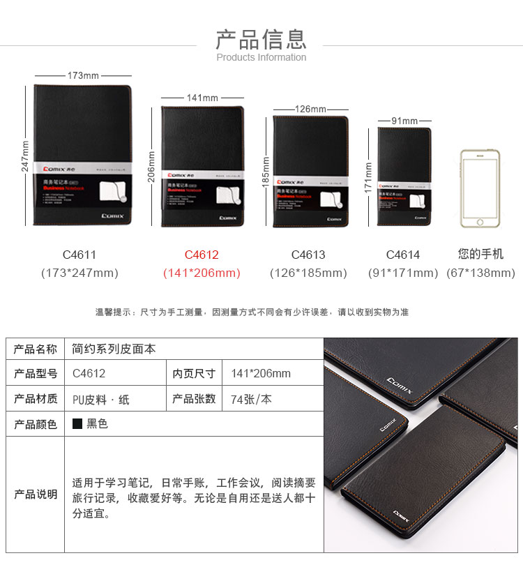 商品名称:齐心C4612 皮面笔记本子/记事本 黑色 25K 74页