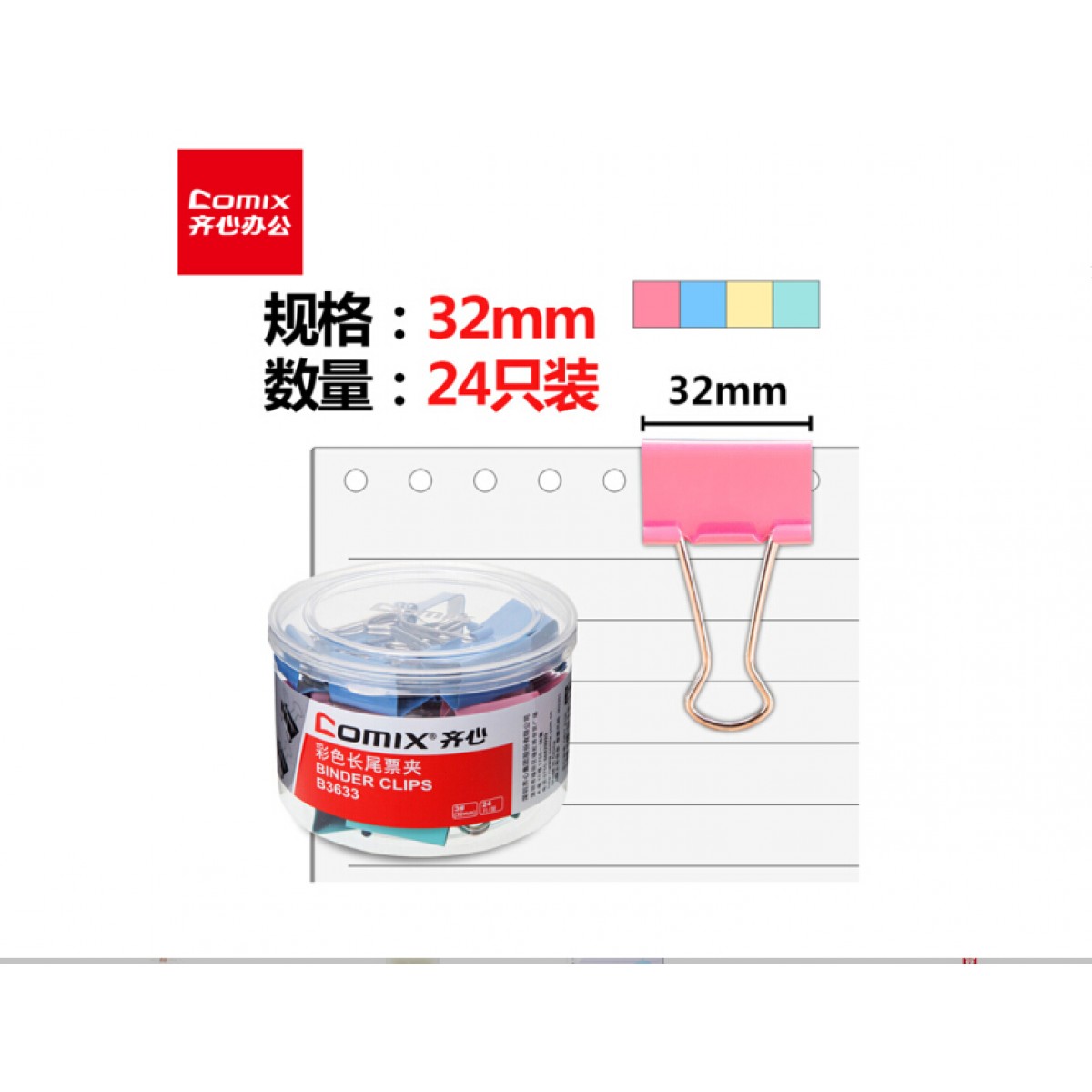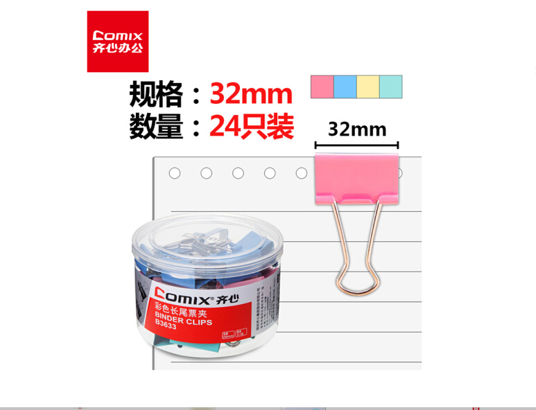 商品名称:齐心B3633彩色长尾夹3#32mm 24只/筒