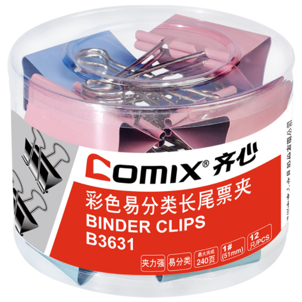 齐心B3631彩色长尾夹1#51MM 12只/筒