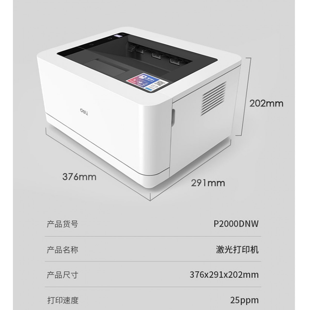 商品名称:得力P2000DNW激光打印机 最大支持幅面A4 无线双面打印 白色 单位:台