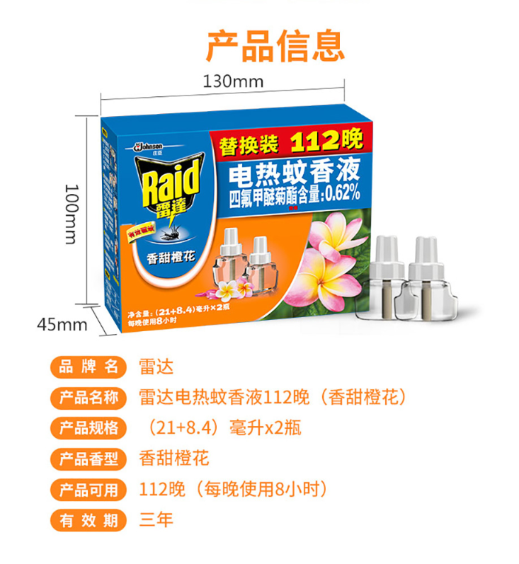 商品名称:雷达电热蚊香液112晚替换装(香甜橙花)2瓶/盒