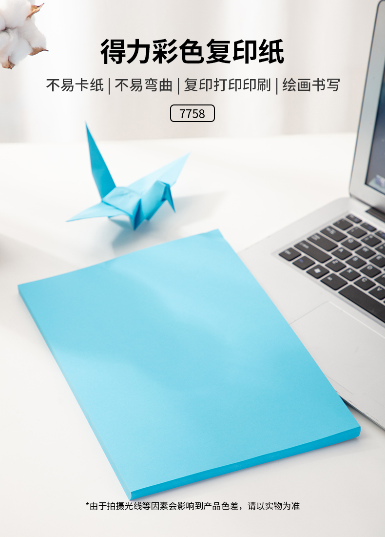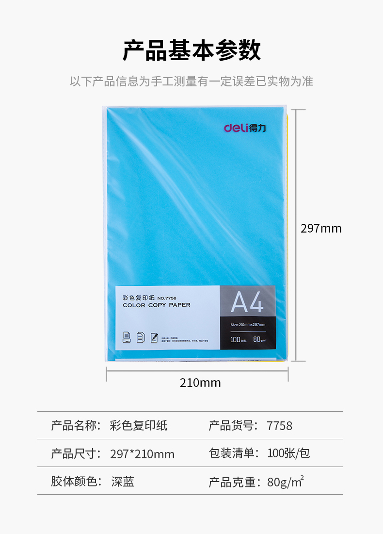 商品名称:得力7758彩色复印纸 A4 80g 100张/包 深蓝色 单位:包