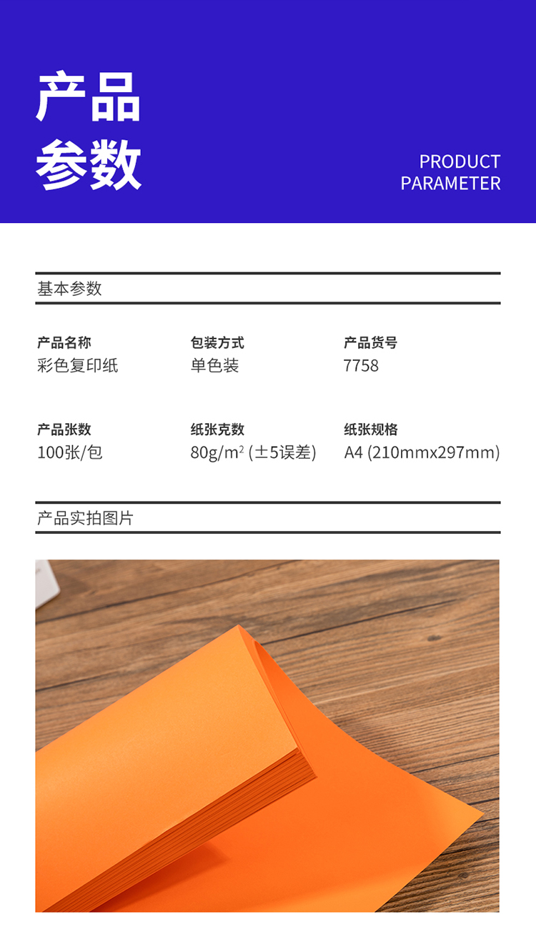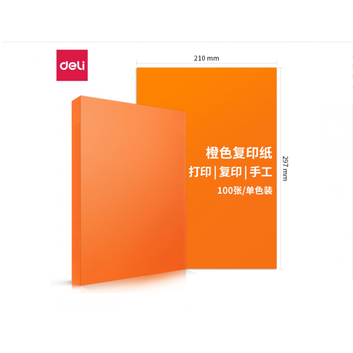 商品名称:得力7758彩色复印纸 A4 80g 100张/包 橙色 单位:包