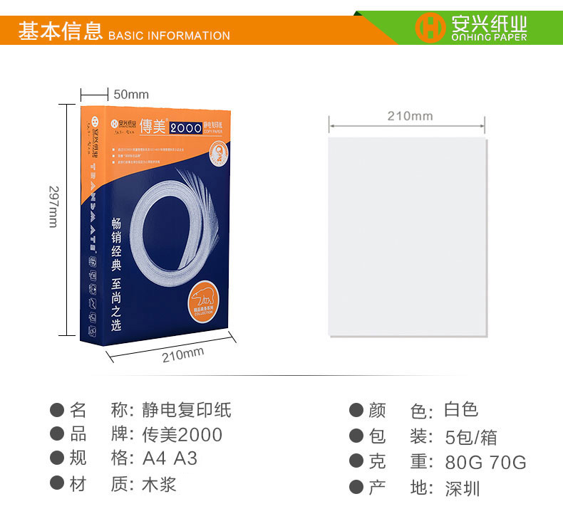 商品名称:传美2000复印纸 A3 80g 500张/包 5包/箱 单位:包