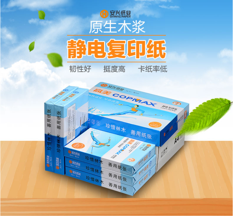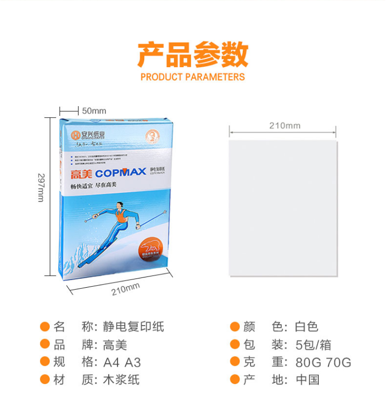商品名称:安兴高美复印纸 A4 80G 500页/包 10包/箱(单位:包)