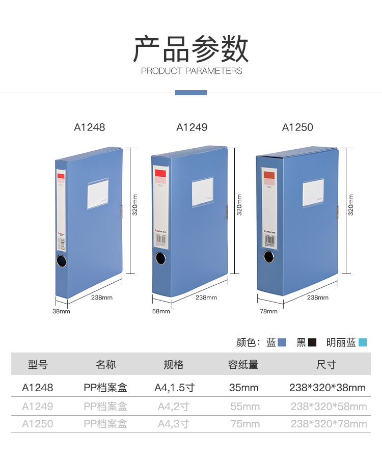 商品名称:齐心A1248 PP档案盒A4 35mm 蓝色(单位:个)