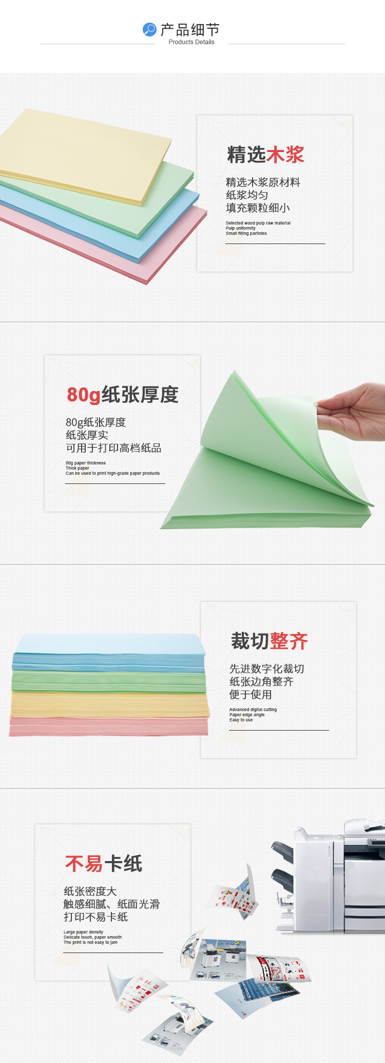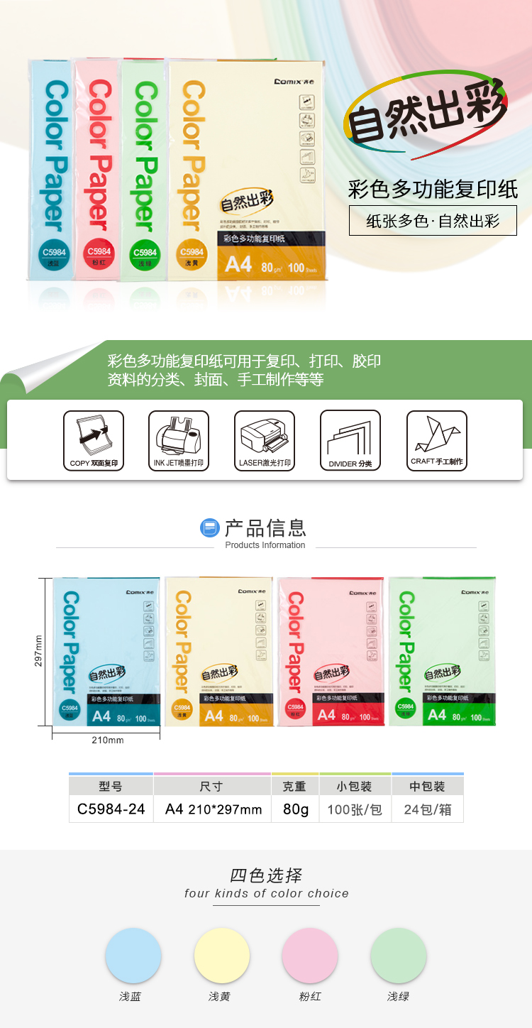 商品名称:齐心C5984-24彩色多功能复印纸 A4 80g 100张/包 24包/箱 粉红 单位:包