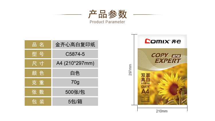 商品名称:齐心C5874金齐心高白复印纸 A4 70g 500张/包 5包/箱 单位:包