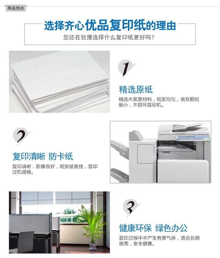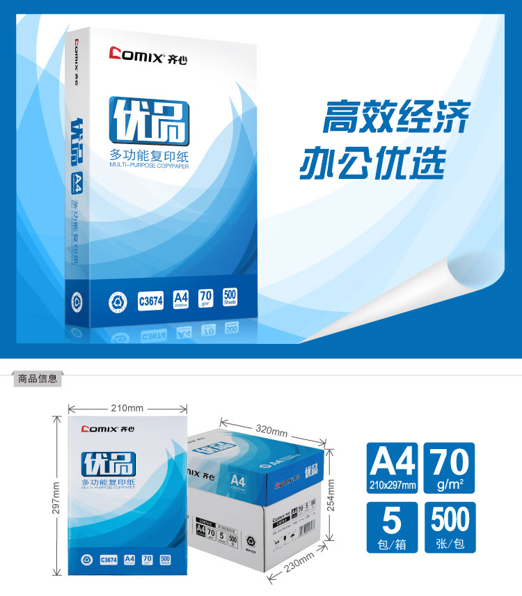 商品名称:齐心C3674优品复印纸 A4 70g 500张/包 5包/箱 单位:包