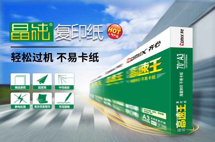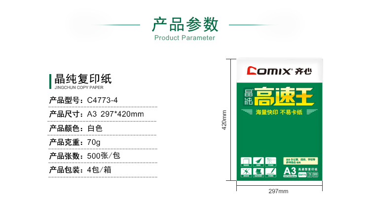 商品名称:齐心C4773晶纯高速王复印纸 A3 70g 500张/包 4包/箱 单位:包