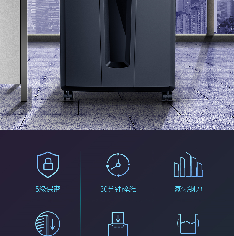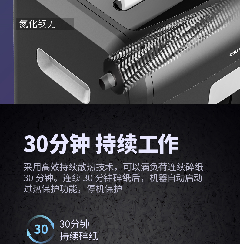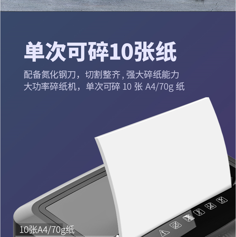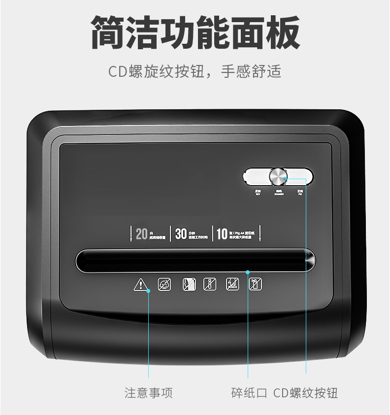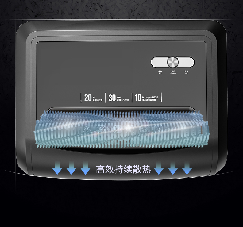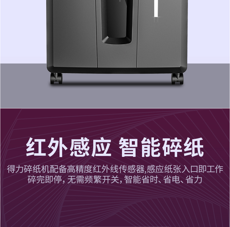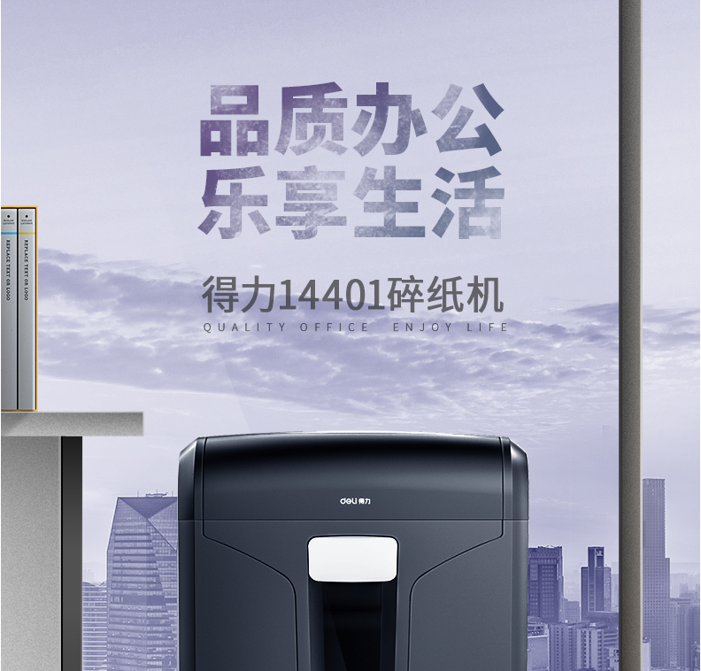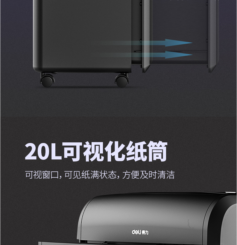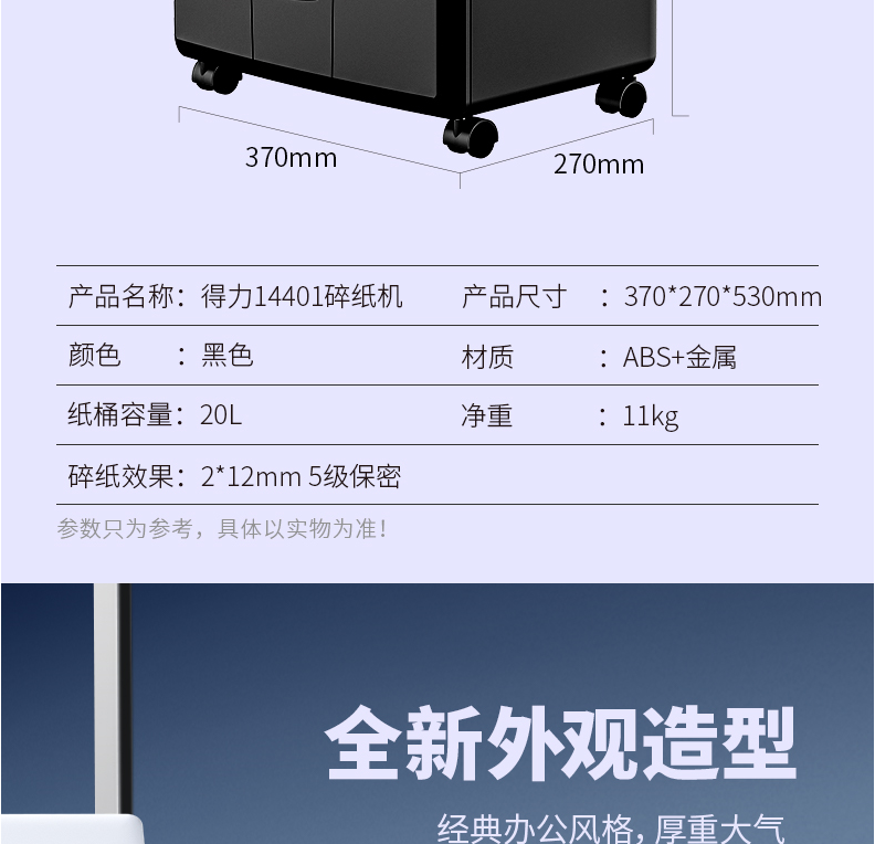 商品名称:得力14401碎纸机 5级保密 单次可碎10张 连续碎纸30分钟 最大碎纸幅面A4 容量20L 可碎卡、光盘 黑色 单位:台