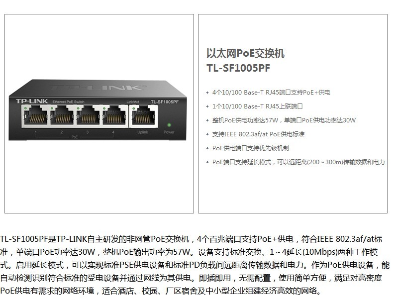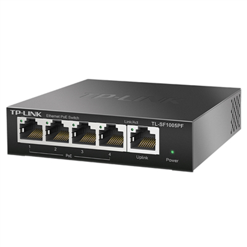 TP-LINK交换机TL-SF1005PF(PoE端口支持延长模式,可以远距离(200~300m)传输数据和电力4个10/100 Base-T RJ45端口支持PoE+供电,1个10/100 Base-T RJ45上联端口)