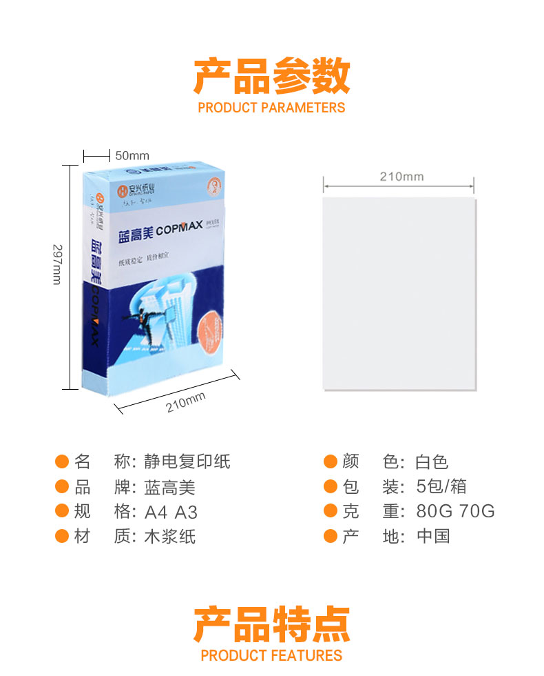商品名称:蓝高美复印纸 A3 80g 500页/包 5包/箱 (单位:包)