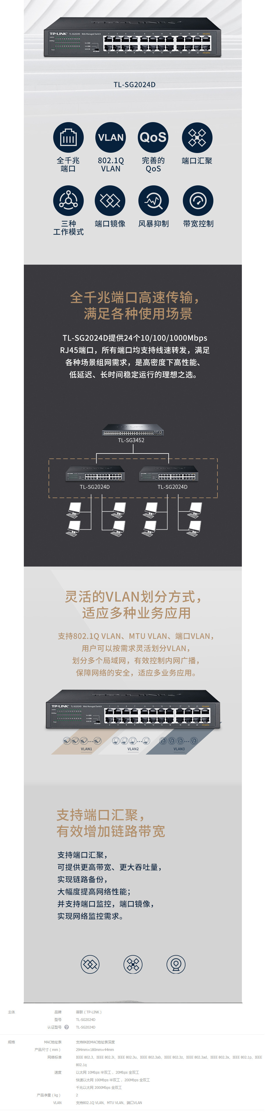 简单网管交换机,全千兆,24个千兆网口;桌面式;支持802.1Q VLAN;支持QoS、带宽控制、风暴抑制;支持端口汇聚、镜像、监控;支持线缆检测、环回保护;支持Web管理、VLAN隔离、标准交换三种模式