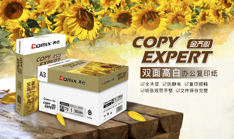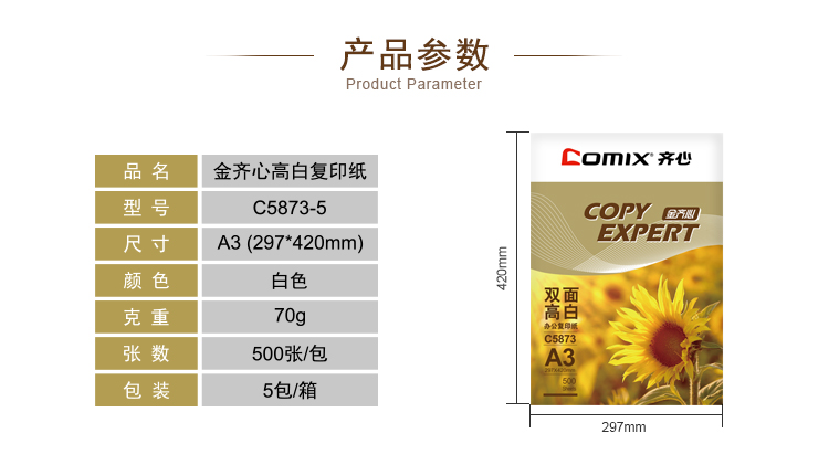 商品名称:齐心C5873-5金齐心高白复印纸 A3 70g 500张/包 5包/箱 单位:箱