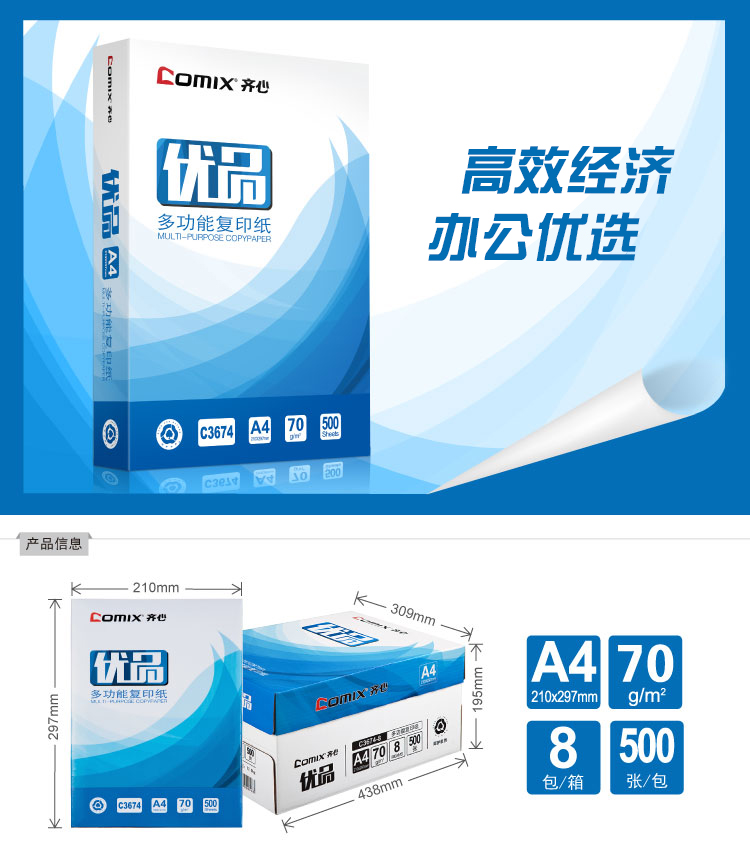 商品名称:齐心C3674-5优品复印纸 A4 70g 500张/包 5包/箱 单位:箱
