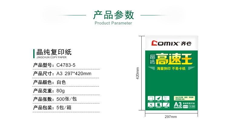 商品名称:齐心C4783晶纯高速王复印纸 A3 80g 500张/包 5包/箱 单位:包