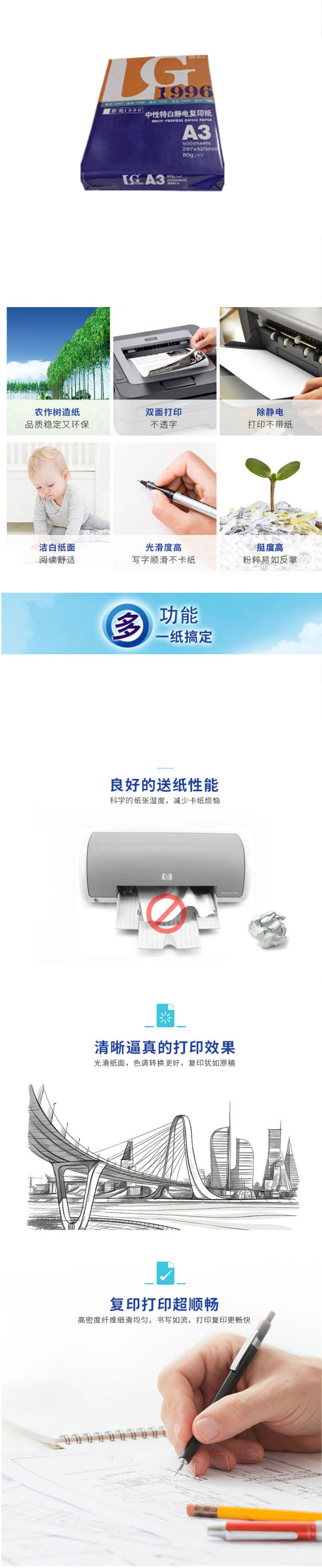 商品名称:蓝光1996复印纸 A3 80g 500张/包 5包/箱 单位:包