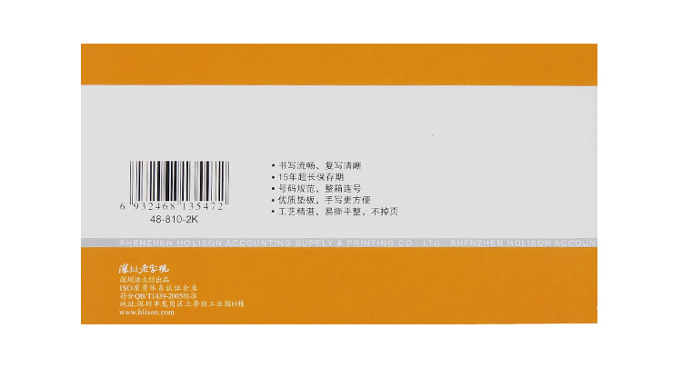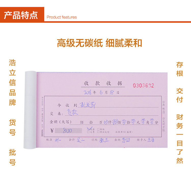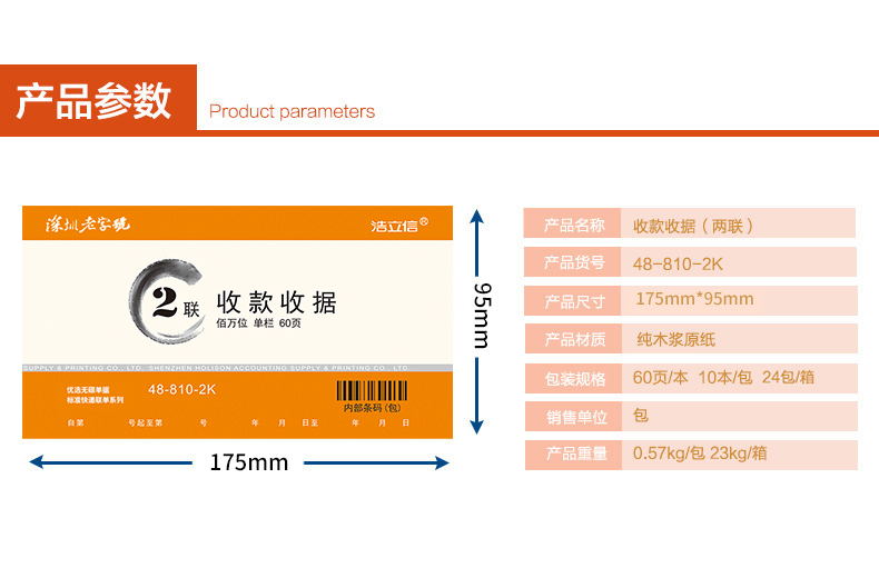 商品名称:浩立信48-810-2K百万位单栏二联收款收据175*95mm 10本/包×60页/本 带撕裂线无碳复写(单位:本)