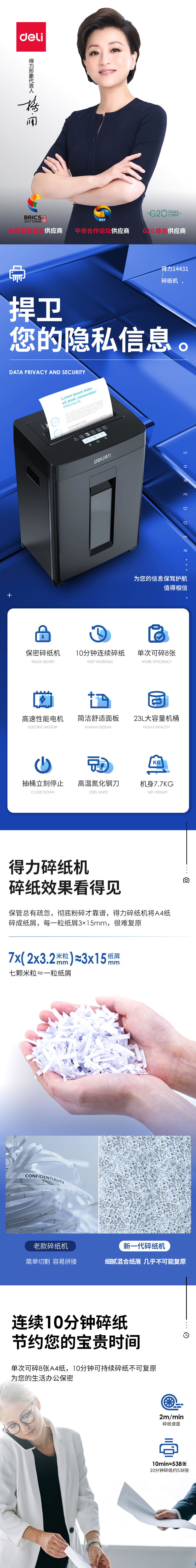 商品名称:得力14431碎纸机 4级保密 单次可碎8张 连续碎纸10分钟 最大碎纸幅面A4 容量23L 黑色 单位:台