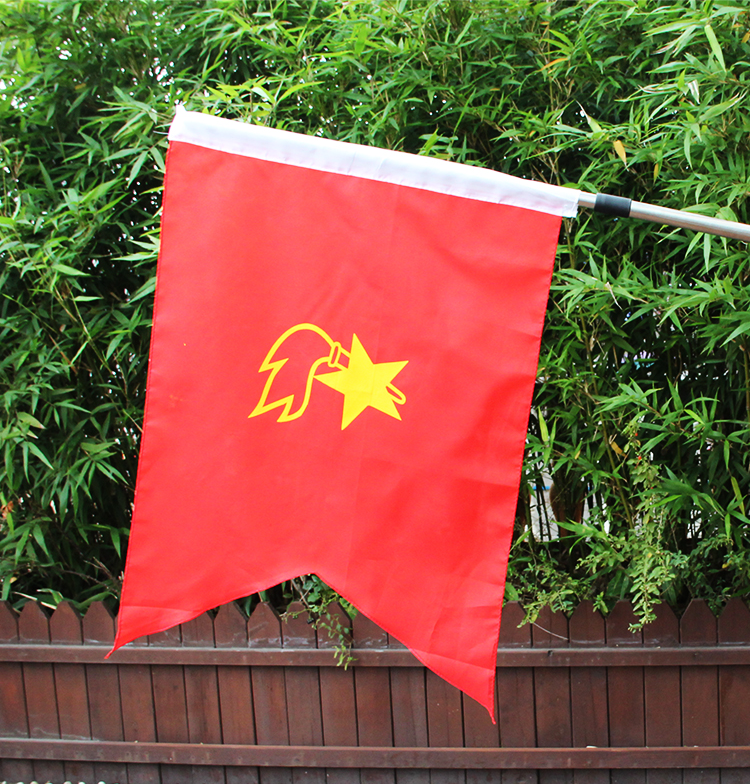 中队旗(长80厘米、高60厘米。右端剪去高20厘米、底宽60厘米的等腰三角形,形成一个三角形缺口,五角星及火炬在以60厘米为边长的正方形中心)