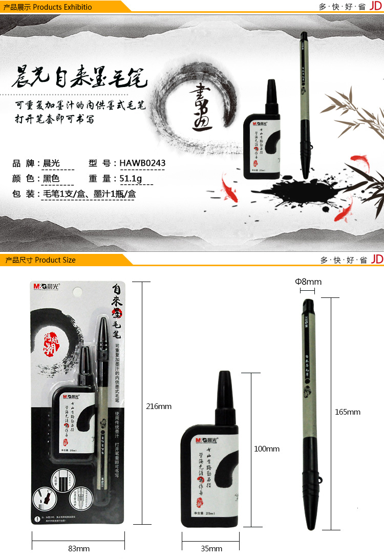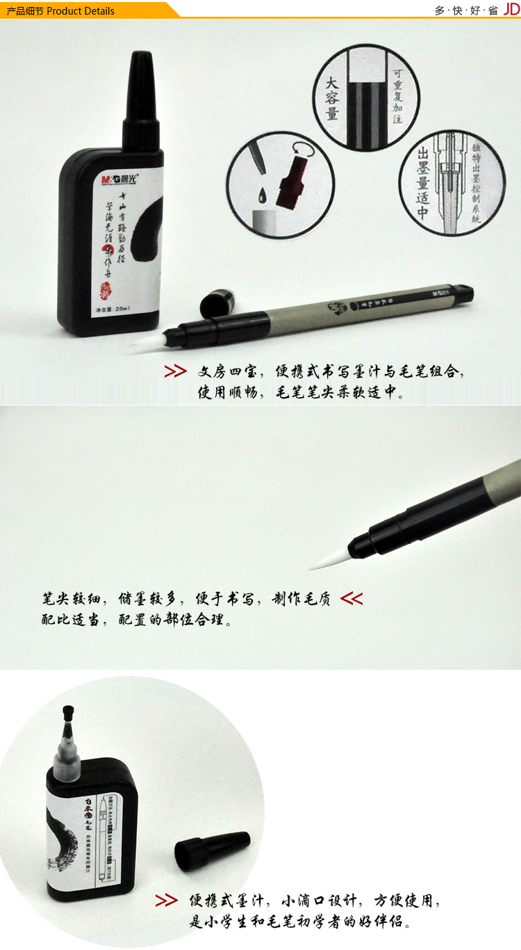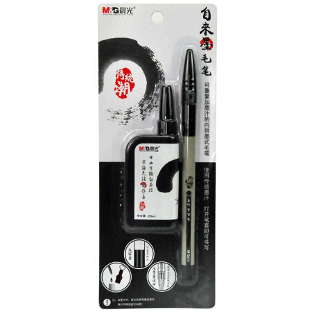 自来墨毛笔使用传统墨汁 打开即可书写 可以反复添加墨汁的内供墨式毛笔 出墨量适中 使用、携带都很方便笔锋采用纤维材料,不用清洗,书写后都能保持挺直 笔套将笔头部分密封,避免出现墨干现象