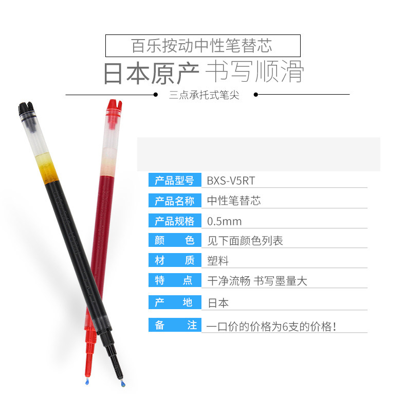 商品名称:百乐BXS-V5RT中性笔芯适用BXRT-V5笔0.5mm(单位:支)