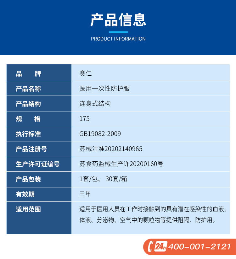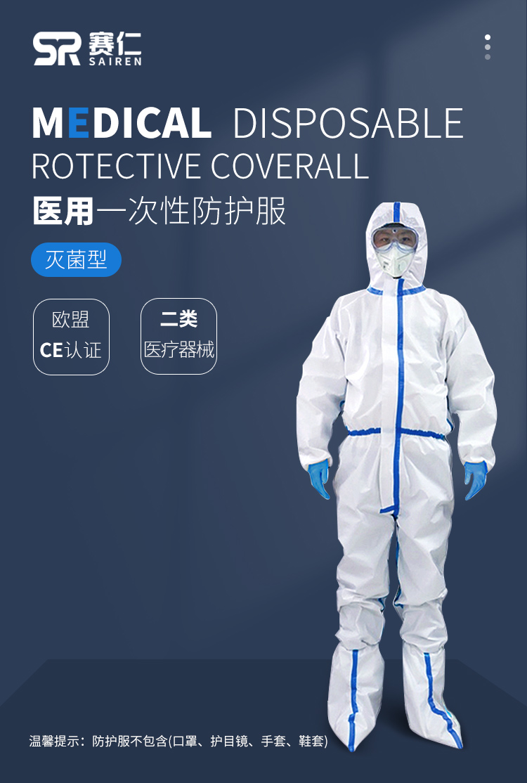商品名称:赛仁一次性医用防护服 欧盟CE认证 均码(160-180cm) (单位:件)