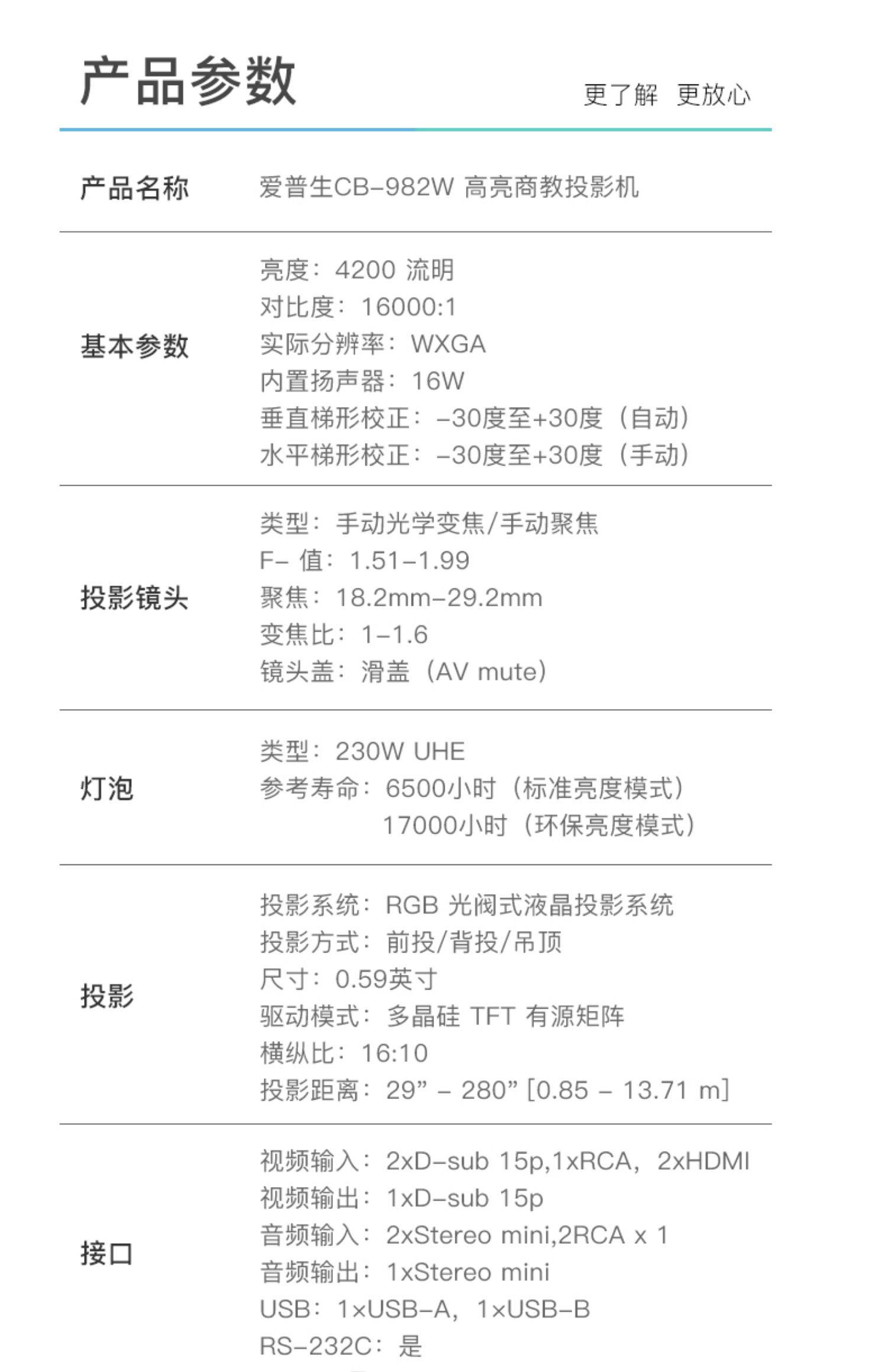商品名称:爱普生CB-982W投影仪(含品跃84英寸16:9幕布/吊架/HIMI信号线/电源线材/安装调试费用)(单位:台)