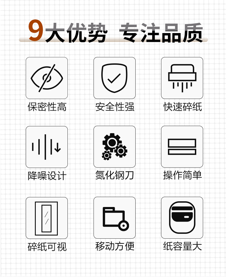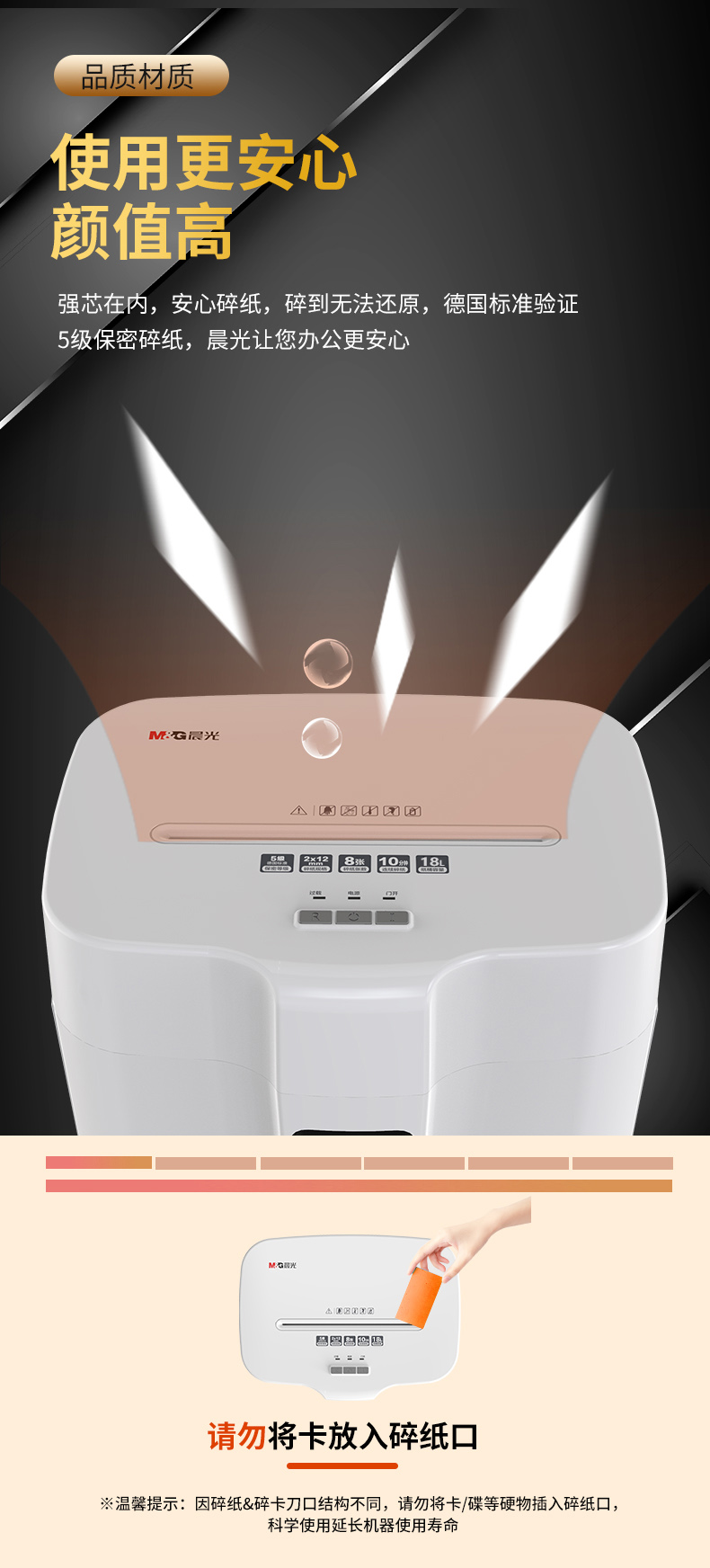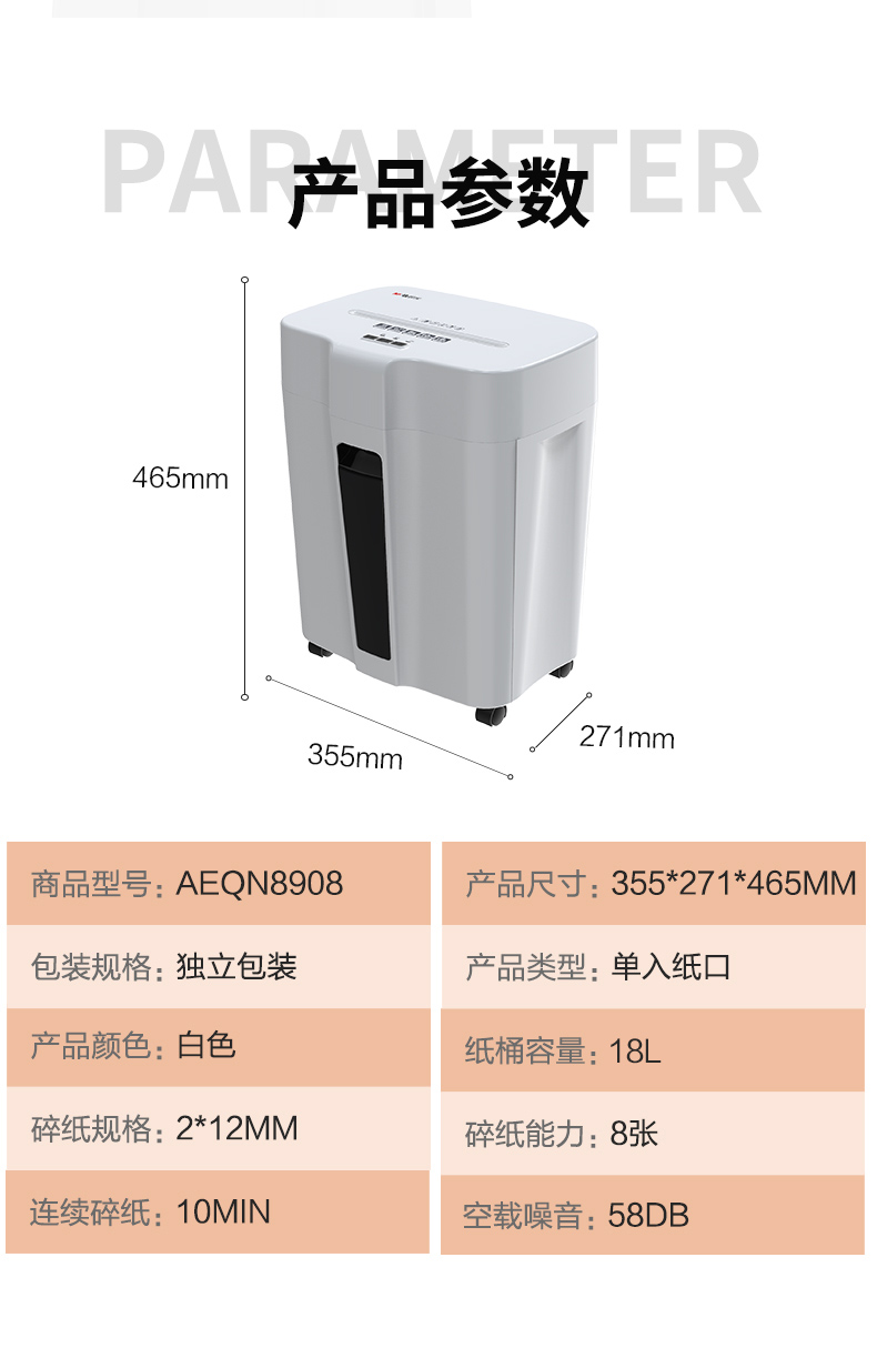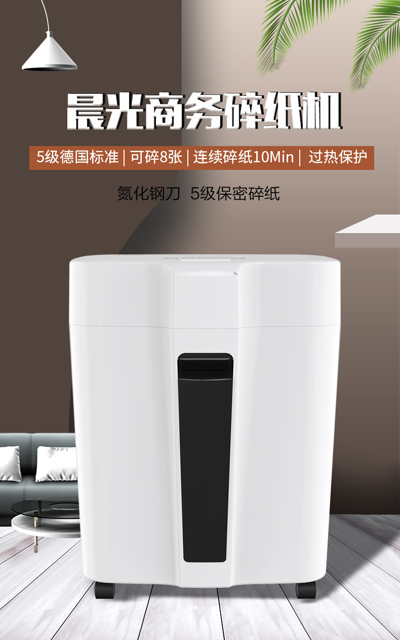 商品名称:晨光AEQN8908碎纸机 5级保密 单次可碎8张 连续碎纸10分钟 最大碎纸幅面A4 容量18L 单位:台