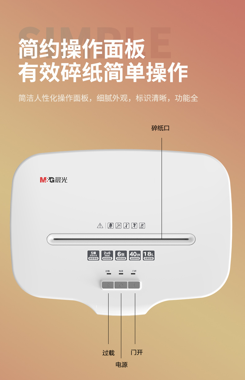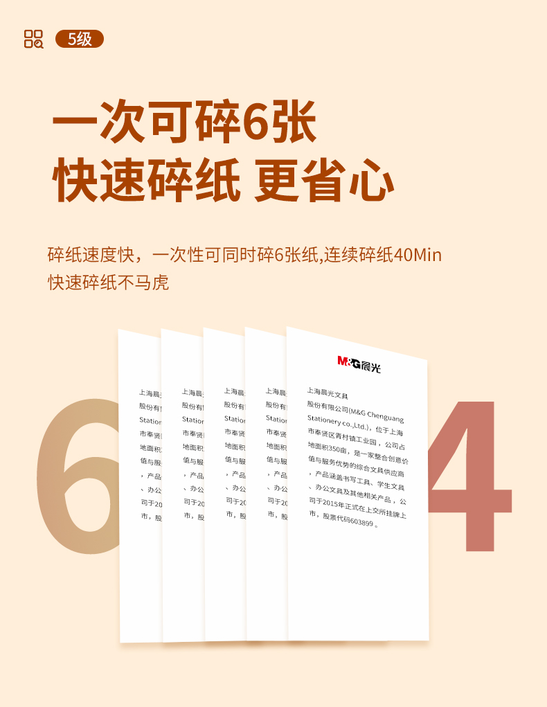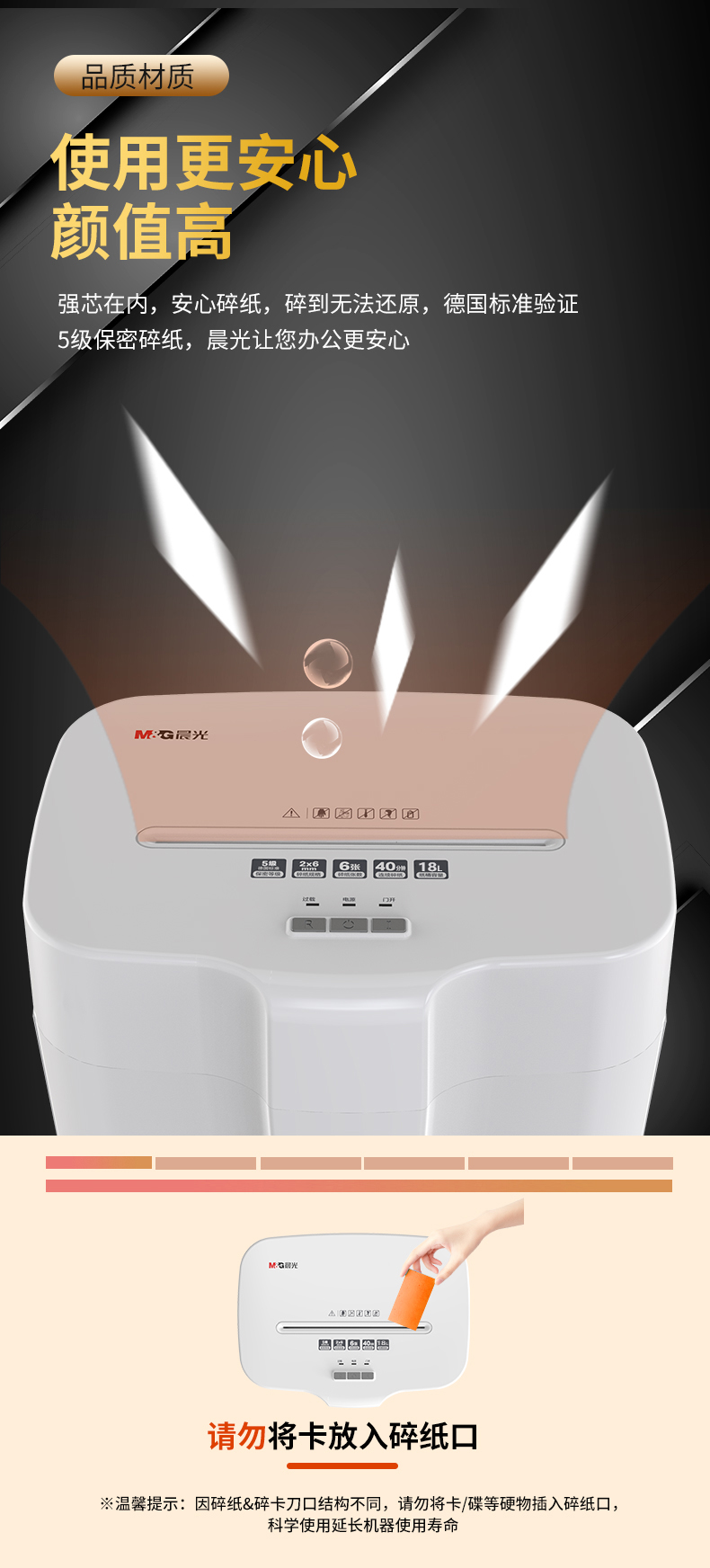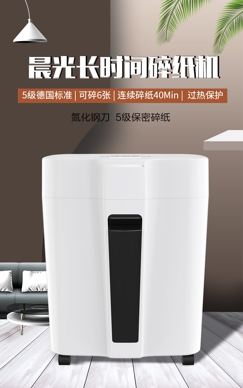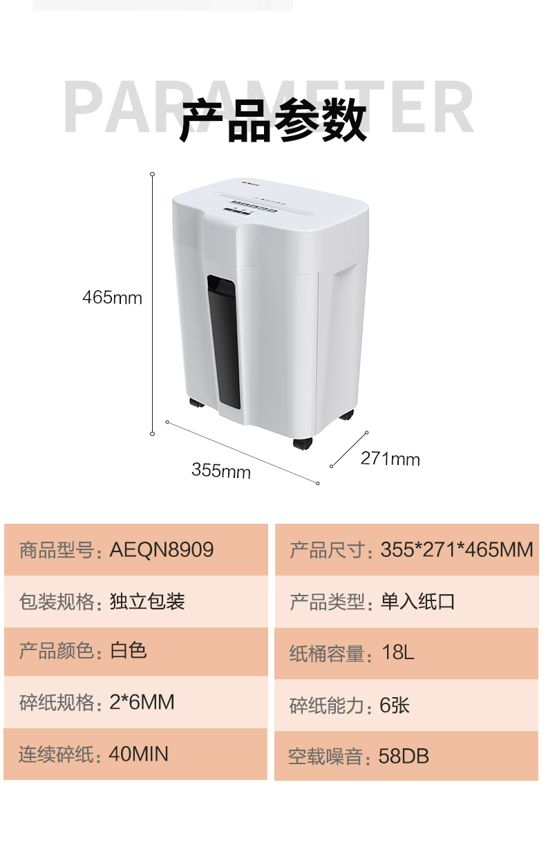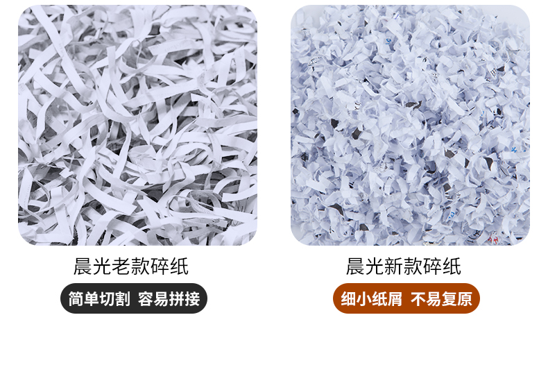 商品名称:晨光AEQN8909碎纸机 5级保密 单次可碎6张 连续碎纸40分钟 最大碎纸幅面A4 容量18L 单位:台