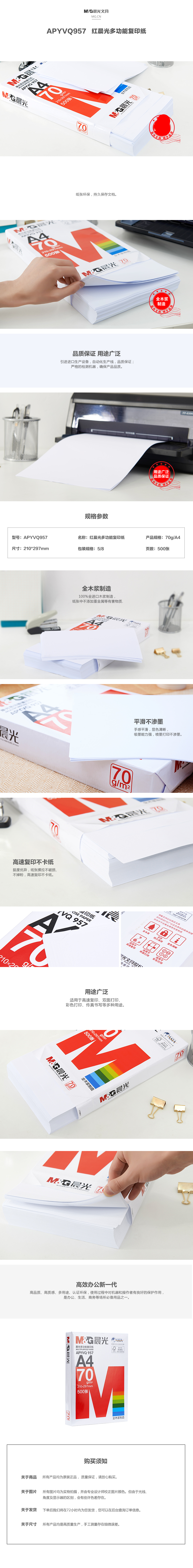商品名称:红晨光APYVQ957A复印纸 A4 70g 500张/包 8包/箱(单位:箱)