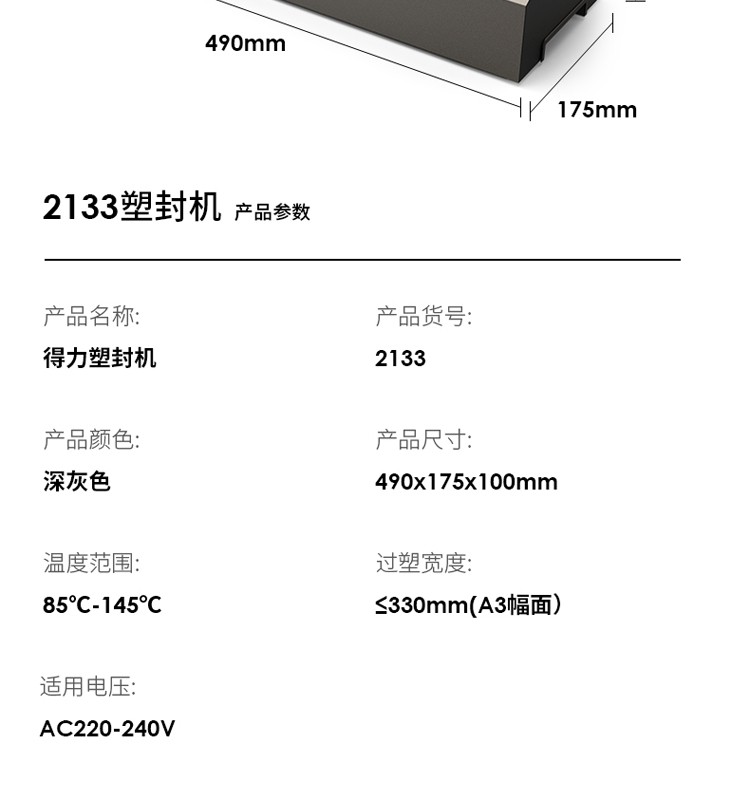 得力2133塑封机 深灰(单位:台)