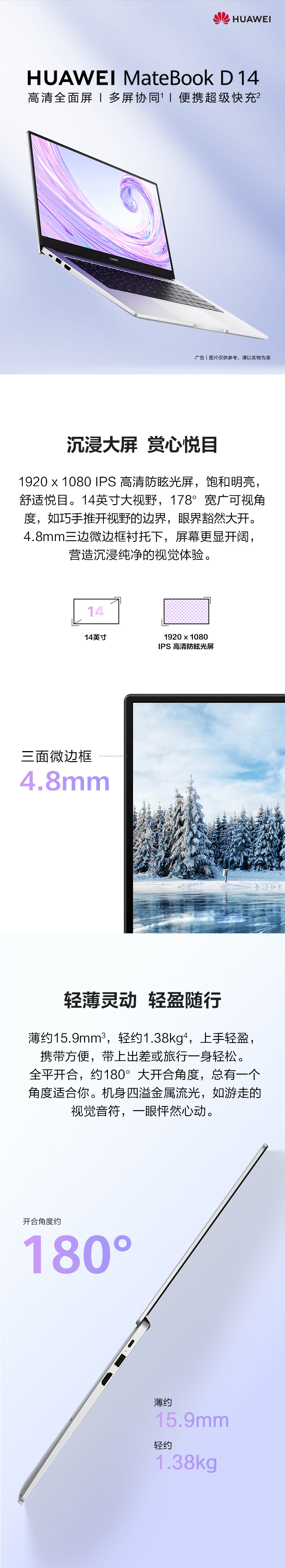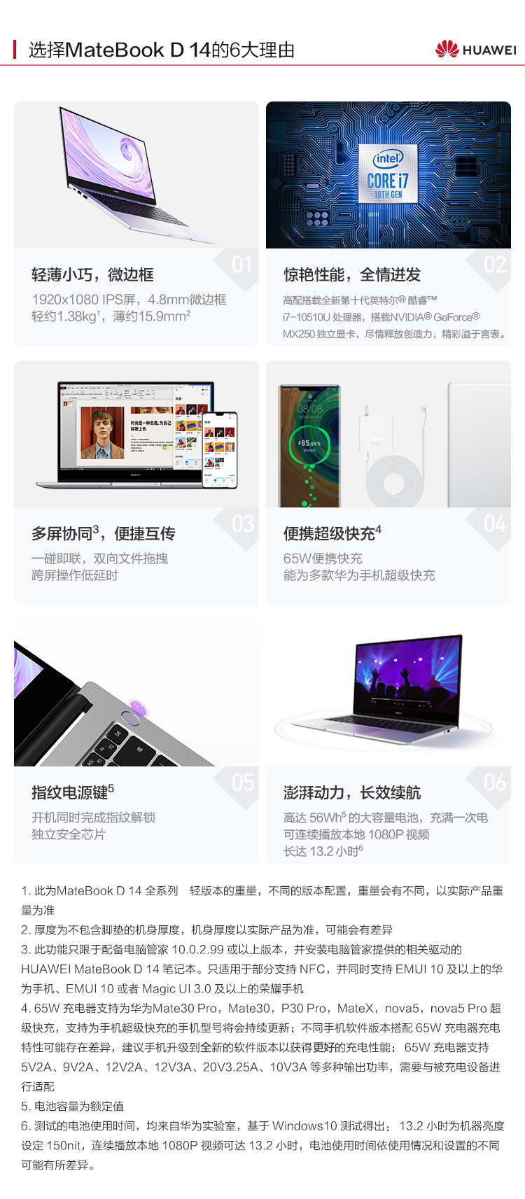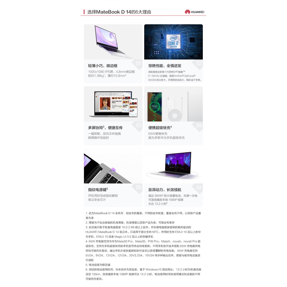 华为Matebook D14 2020款 笔记本电脑 NBB-WAE9P I7-10510U/16G/512G SSD/WIN10/鼠标、鼠标垫、电脑包/MX250独显 14英寸