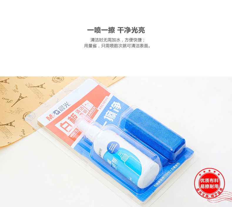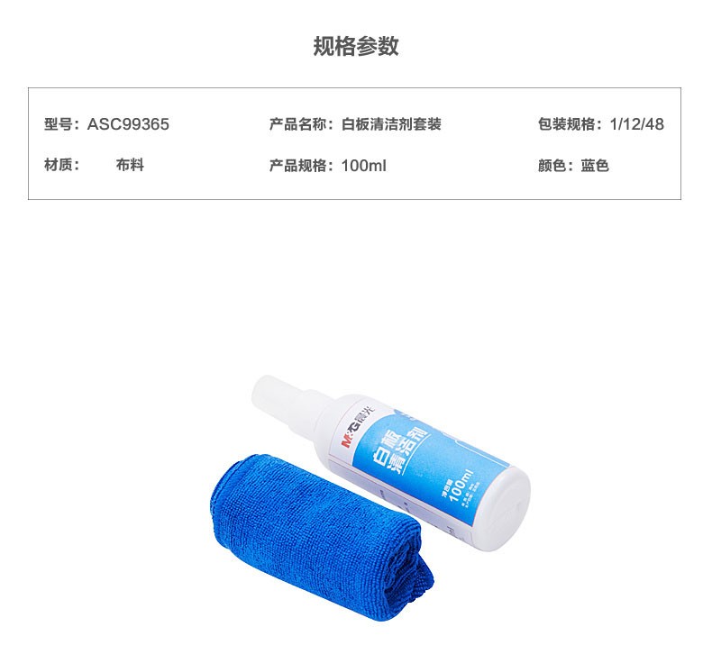商品名称:晨光ASC99365文具会议白板清洁套装 100ml白板清洁剂(黑板/绿板通用)+白板擦布(单位:套)