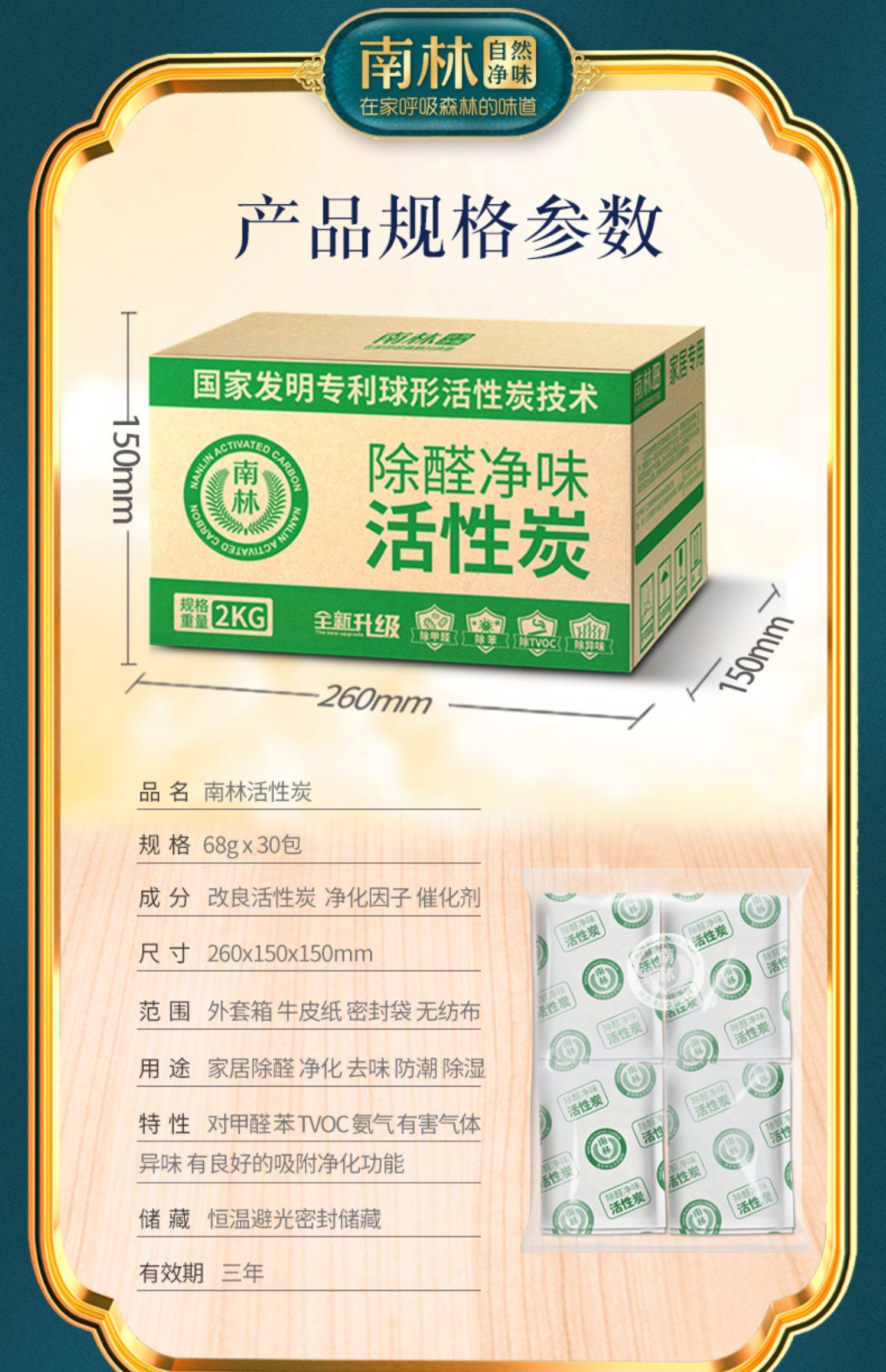 商品名称:南林 除异味清除甲醛神器活性炭碳包3000g净化30-40m² 2000g/箱(单位:箱)