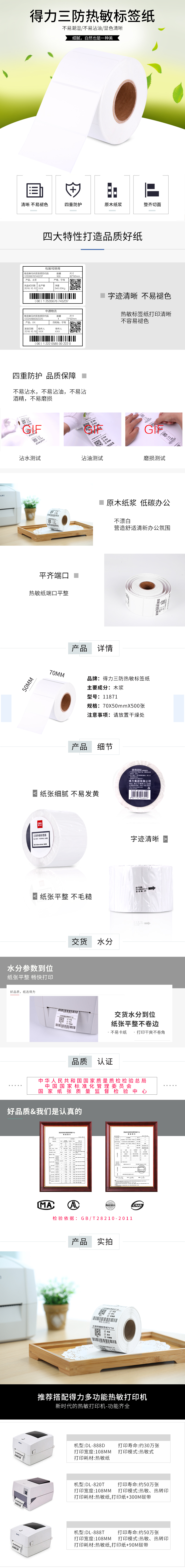商品名称:得力11871三防热敏标签纸70*50 白色 500张/卷(单位:卷)