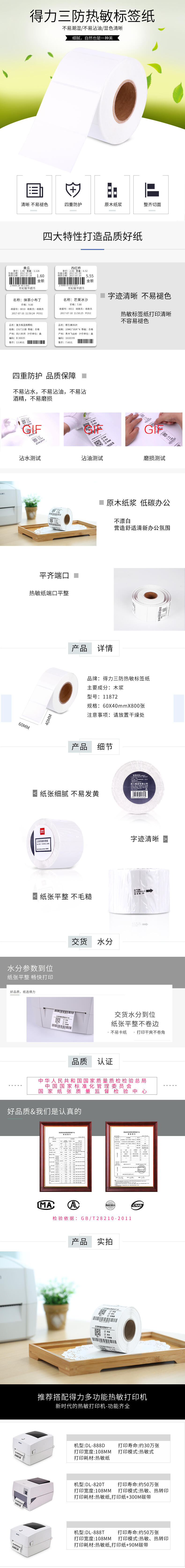 商品名称:得力11872三防热敏标签纸60*40 白色 800张/卷(单位:卷)