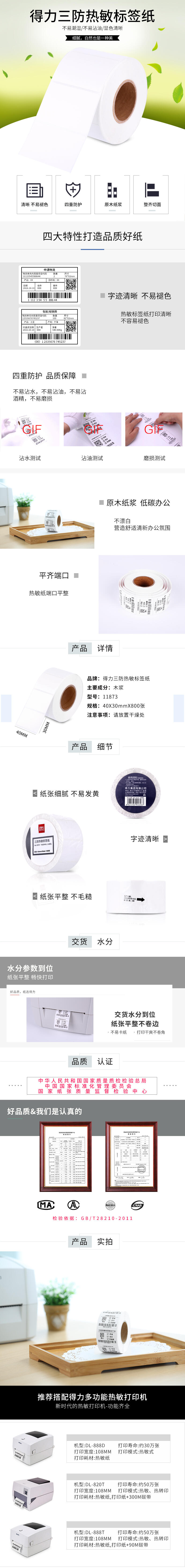 商品名称:得力11873三防热敏标签纸40*30 白色 800张/卷(单位:卷)