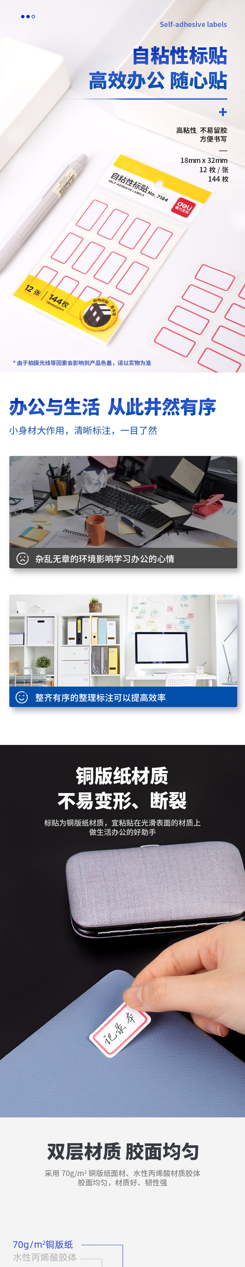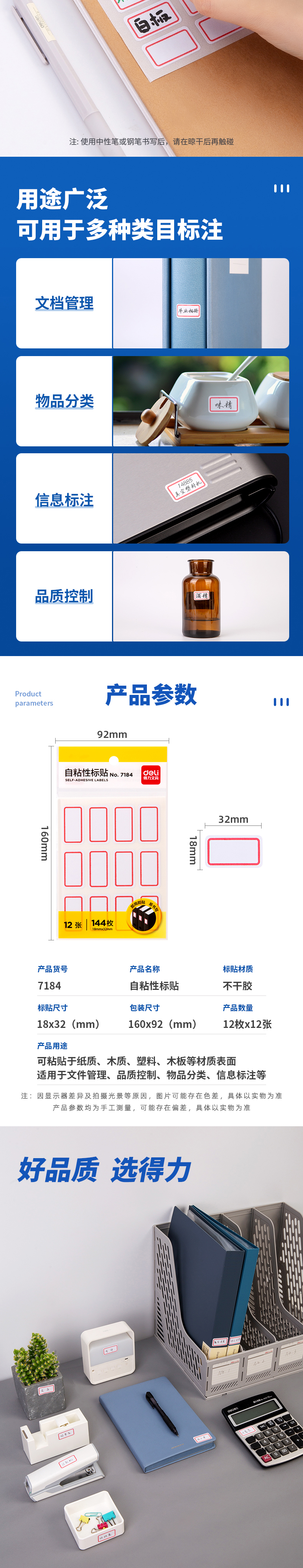 商品名称:得力7184自粘性标贴 白色 18*32mm 12枚/张 12张/本 25本/包(单位:本)
