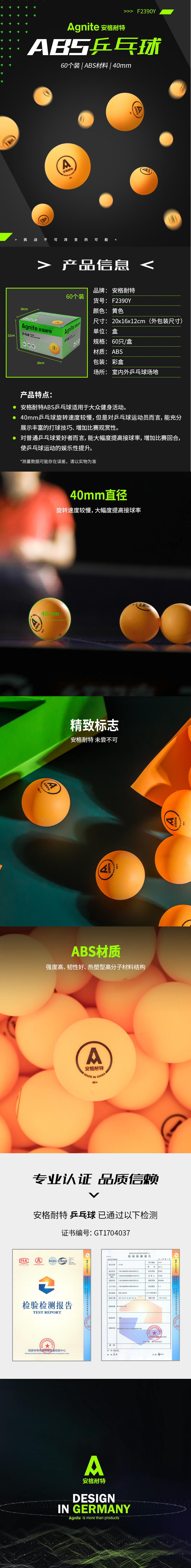 商品名称:安格耐特F2390Y乒乓球 黄色 60个/盒(单位:盒)