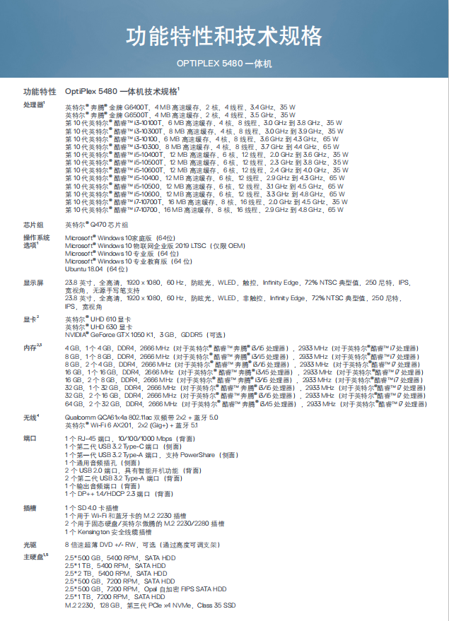 商品名称:戴尔OptiPlex 5480 一体机电脑 (i5-10500T/8GB/256ssd/集显/Win10 home/23.8英寸显示器/摄像头+无线盘鼠标键/三年保修)(单位:台)