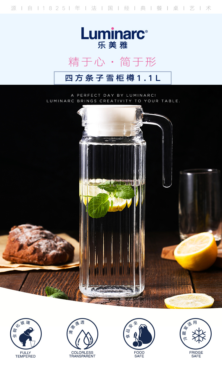 商品名称:乐美雅 23541无铅玻璃冷水壶 四方透明条壶 1.1L(单位:个)
