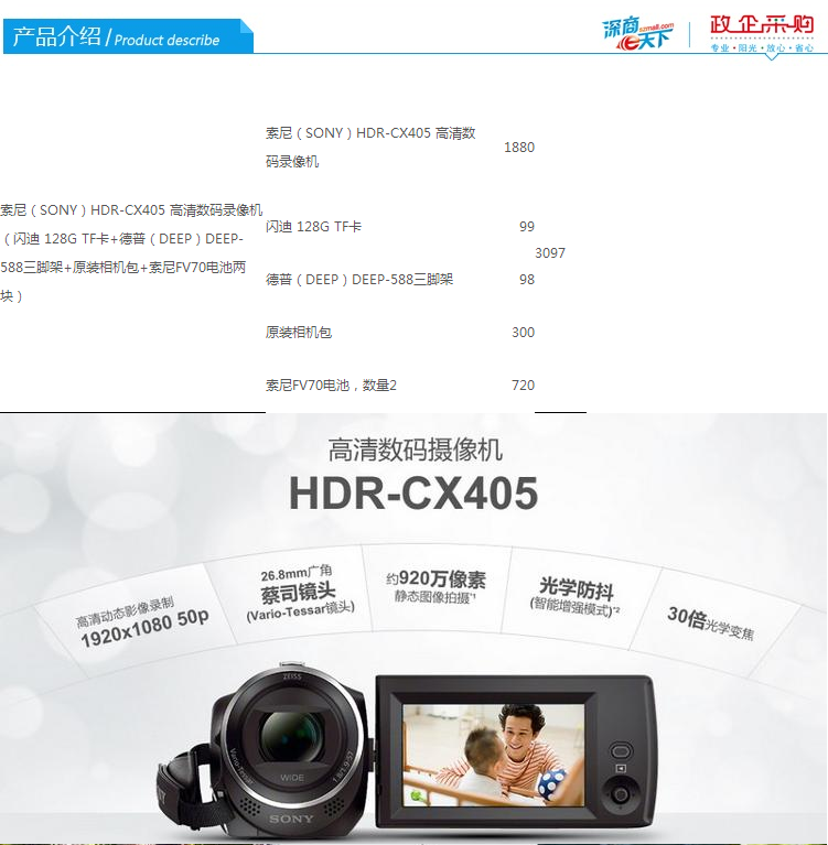商品名称:索尼 HDR-CX405 高清数码摄像机(闪迪256G卡/沣标摄像机包/沣标S-254三脚架/沣标清洁套装+沣标BX1电池和充电器套装) (单位:套)