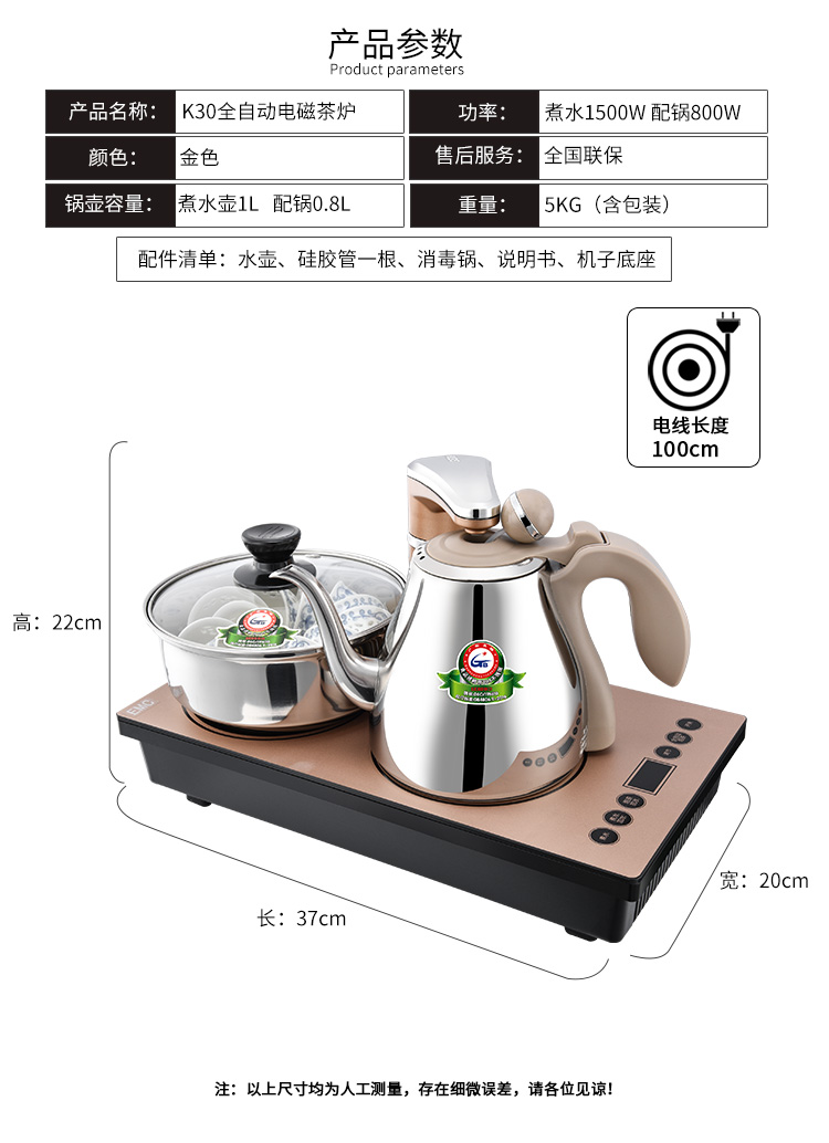 商品名称:新功K30茶具套装全自动上水电磁茶炉304不锈钢茶壶 金色 37*20(单位:套)