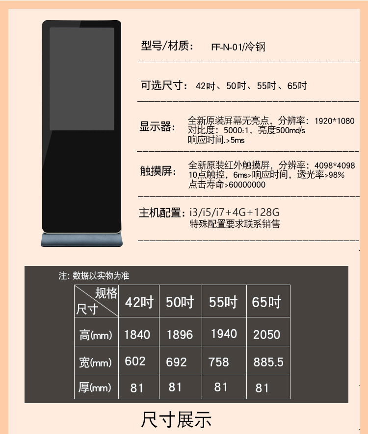 商品名称:智美科CK-SZBP-HWP65 65英寸立式广告机触摸屏查询一体机 高清液晶播放显示器触控查询机信息发布广告屏 i5(单位:台)